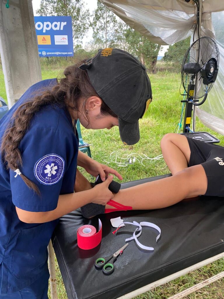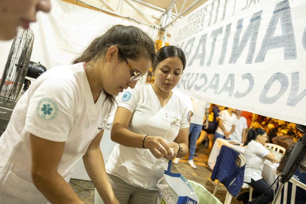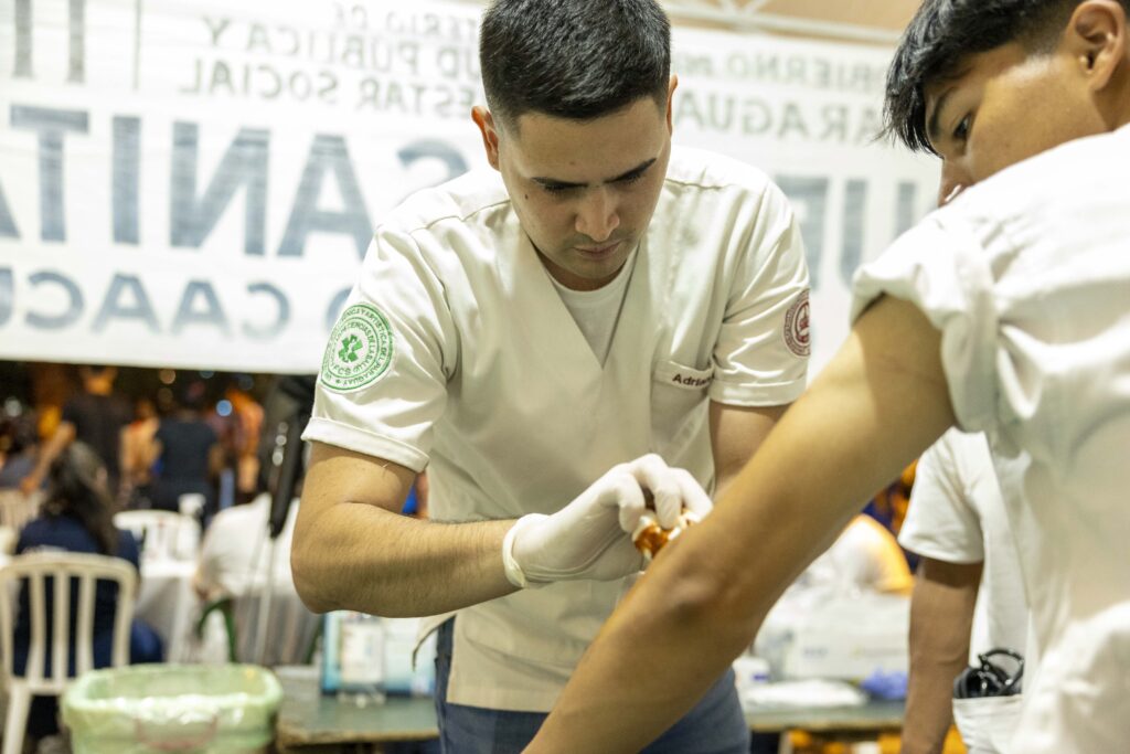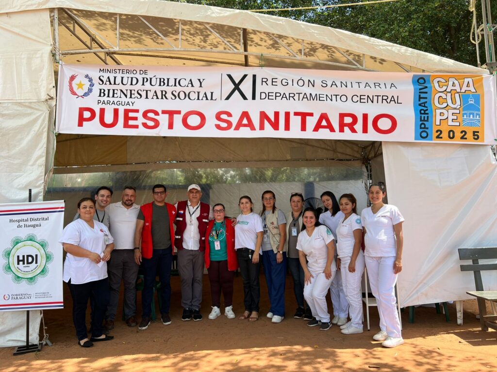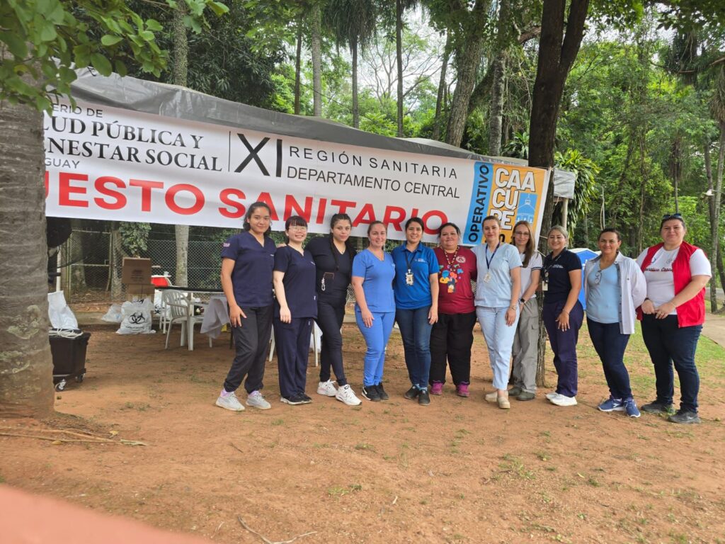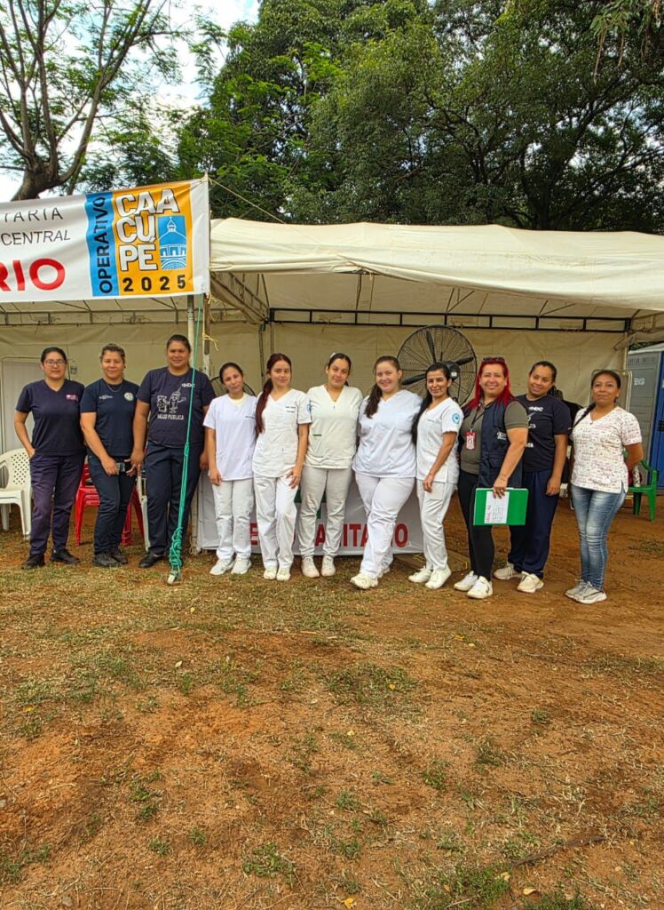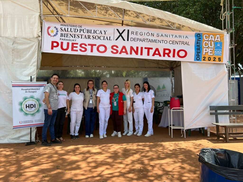 Bajo el lema “Te cuidamos en tu camino a Caacupé”, los días 7 y 8 de diciembre, de 08:00 a 16:00, los estudiantes instalaron un punto de atención en la plaza central de Caacupé, desde donde brindaron valoración de signos vitales, curaciones, primeros auxilios, orientación sanitaria, detección de signos de alarma y derivación de casos que requerían atención especializada. La labor se desarrolló en articulación con profesionales de la Tercera Región Sanitaria – Cordillera, fortaleciendo la capacidad de respuesta durante una de las celebraciones religiosas más concurridas del país.