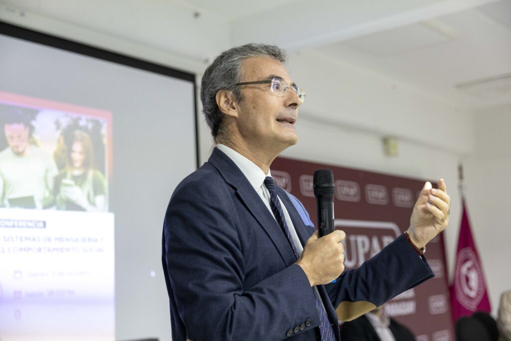 Durante su exposición, el Dr. Ricardo Martín de la Guardia abordó la evolución de los sistemas de mensajería, desde sus orígenes hasta la actual era de la hiperconectividad. A través de un enfoque histórico y sociológico, analizó cómo las plataformas digitales han transformado las formas de interacción, la construcción de vínculos y las dinámicas sociales tanto en el ámbito personal como profesional.