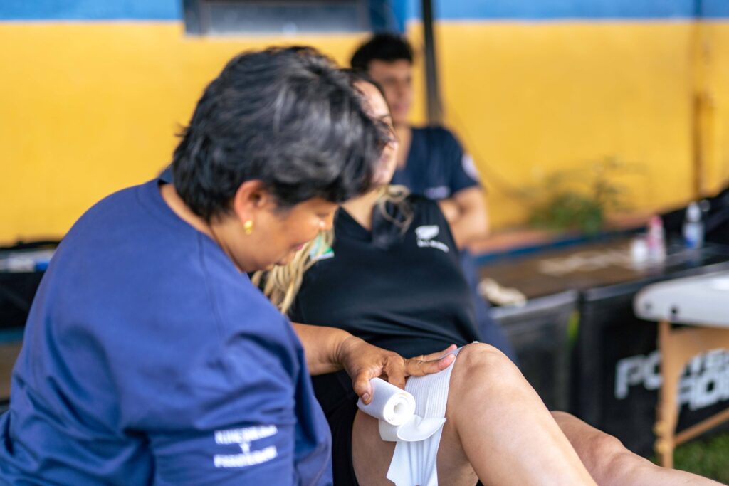 Los estudiantes, bajo la supervisión de los docentes Lic. Blásida Flores y Lic. Ana Mendoza, realizaron dinámicas centradas en la atención integral de los deportistas, que incluyeron asistencia en cancha, aplicación de crioterapia, masajes pre y pos competencia, así como vendajes funcionales y preventivos. Estas acciones permitieron brindar un servicio de apoyo a los jugadores y, al mismo tiempo, consolidar vínculos institucionales entre la universidad y el ámbito deportivo.